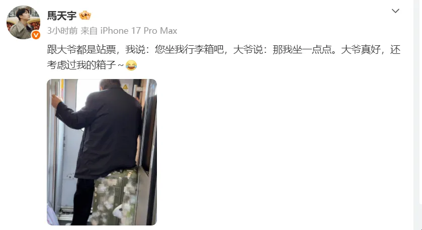 3月9日,演员、歌手马天宇分享日常小美好,马天宇坐高铁买到站票,请同是站票的陌生大爷坐在自己的行李箱上,“大爷说:‘那我坐一点点。’大爷真好,还考虑过我的箱子~”