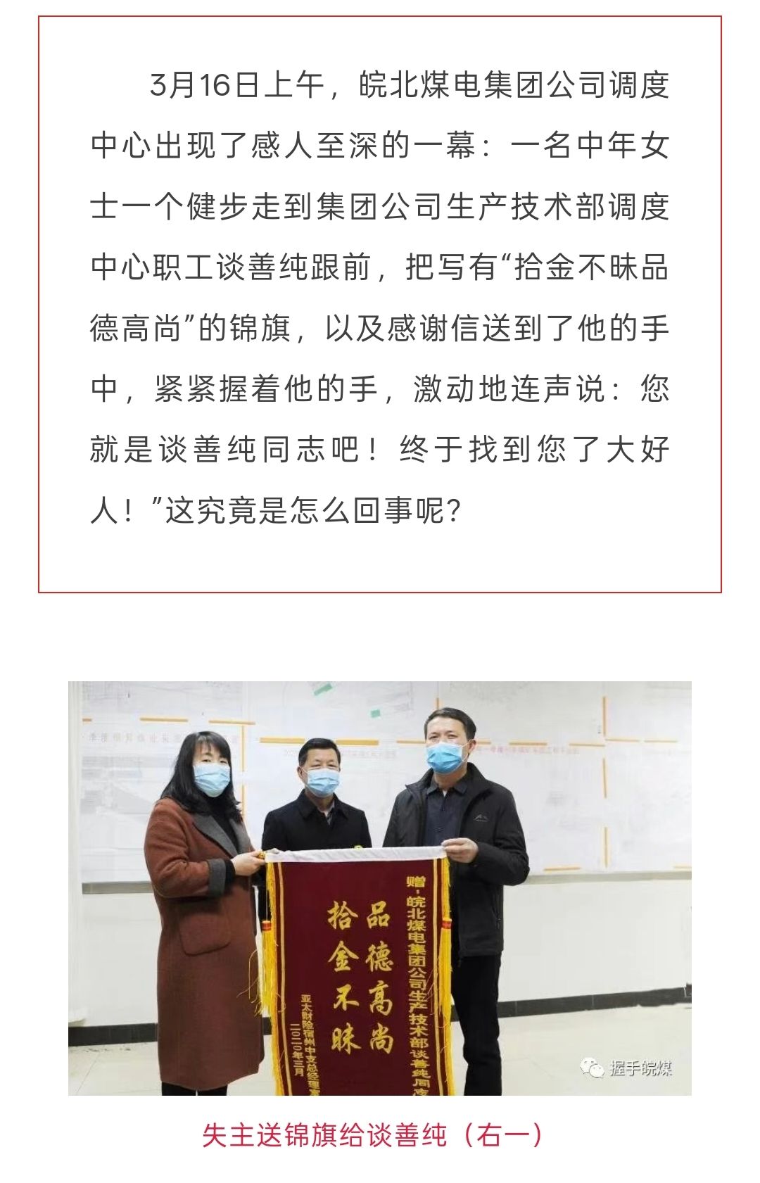 谈磊还介绍,他父亲谈善纯曾因拾金不昧获得表彰,父亲的言行也深深影响了他。记者注意到,2020年3月,安徽省皖北煤电集团有限责任公司官方微信公众号曾发文称,公司职工谈善纯拾到包含3万多元现金、三四张银行卡在内总价值十多万元的包,物归原主,获赠锦旗与感谢信。后谈善纯家庭还被评为“最美家庭”。
