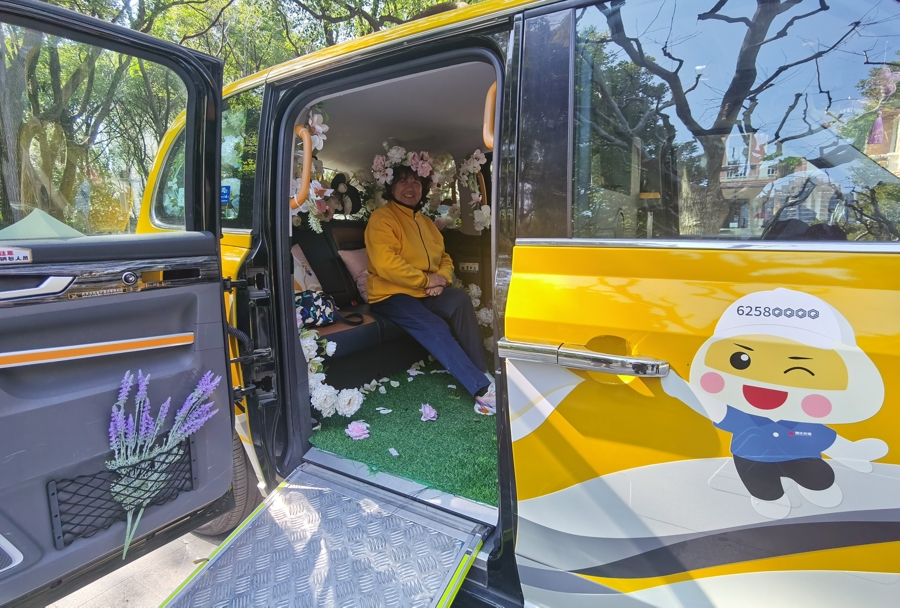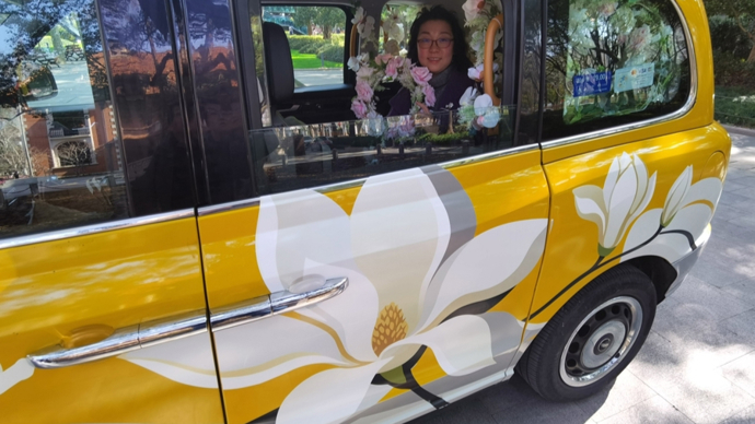 强生出租运营管理中心副经理王清扬优雅地拉开“安心老爷车”的门,请路过的市民参观内饰——座椅周围铺满鲜花,椅子上放着白玉兰靠垫。与此同时,车身新喷涂了白玉兰元素,两朵硕大的白玉兰分别“长”在后排座椅两侧的车门外侧。