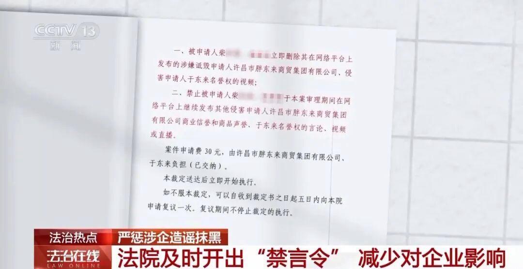 许昌市中级人民法院民事审判第五庭副庭长 李兵:当时这种负面言论已经在不断上升的状态。柴怼怼对于东来,使用一些低俗的语言,肯定会构成个人的名誉侵权。于东来的个人形象又跟企业文化、企业商誉紧密地联系在一起,不管是否构成商业诋毁,个人名誉的这种侵害,已经是可以认定了。所以在有基本事实的情况下,再加上这种必要性和紧急性,合议庭经过合议之后,认为网络侵权的禁言令是有必要的。