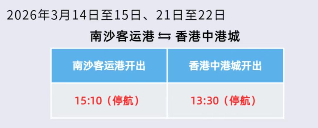 3月10日,记者从南沙客运港方面获悉,受运力调度影响,2026年3月11日至3月23日南沙客运港往返香港中港城、香港国际机场航线部分航班暂停运营。