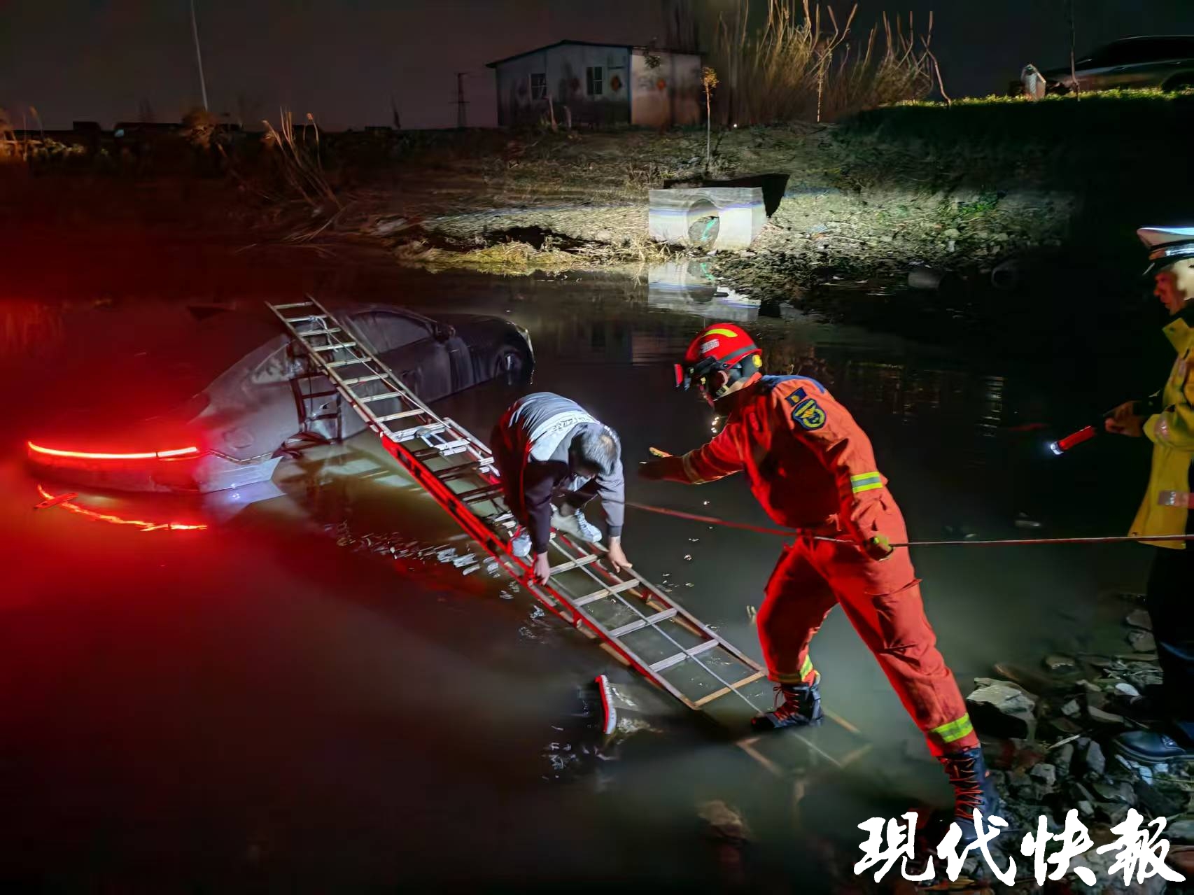 现代快报讯(记者 刘媛 通讯员 吴燕)3月7日晚,泰州泰兴市根思乡,一男子驾车为躲避路面坑洞,急打方向导致车辆瞬间失控冲下河。幸运的是,消防救援人员及时赶到,架设6米拉梯将其营救上岸。