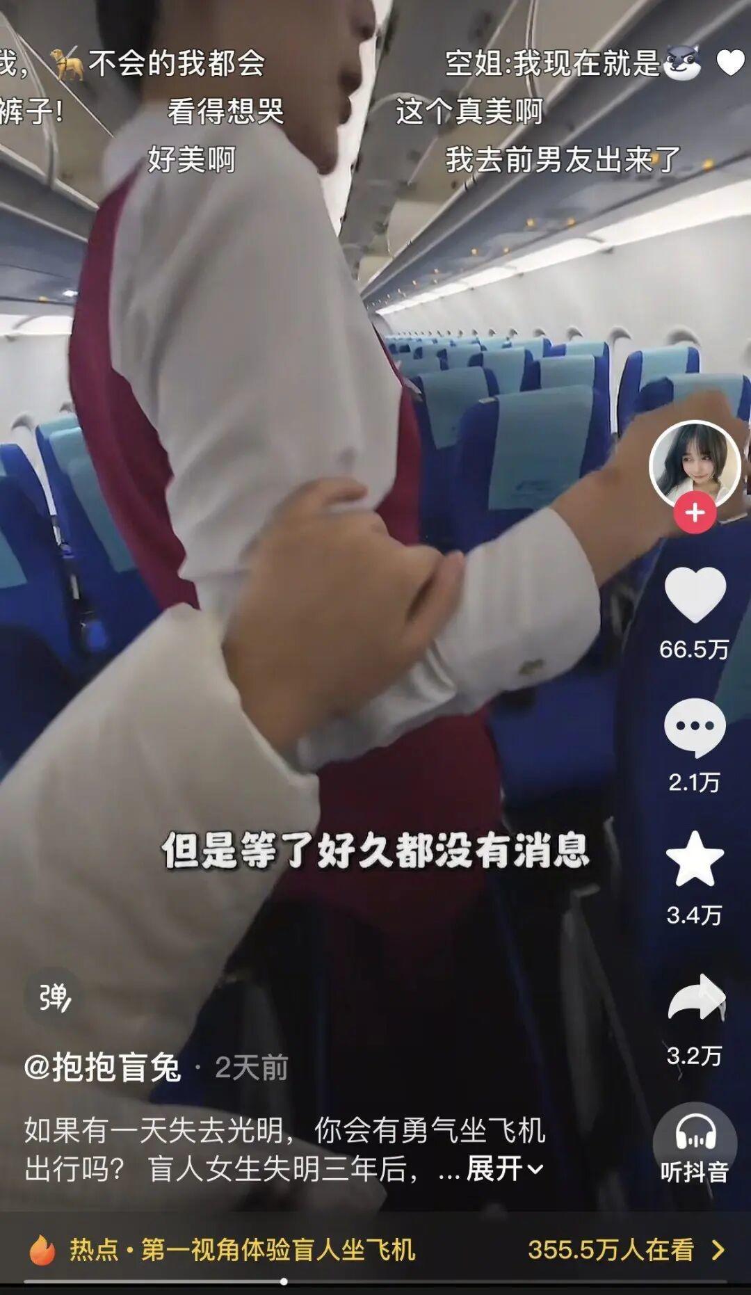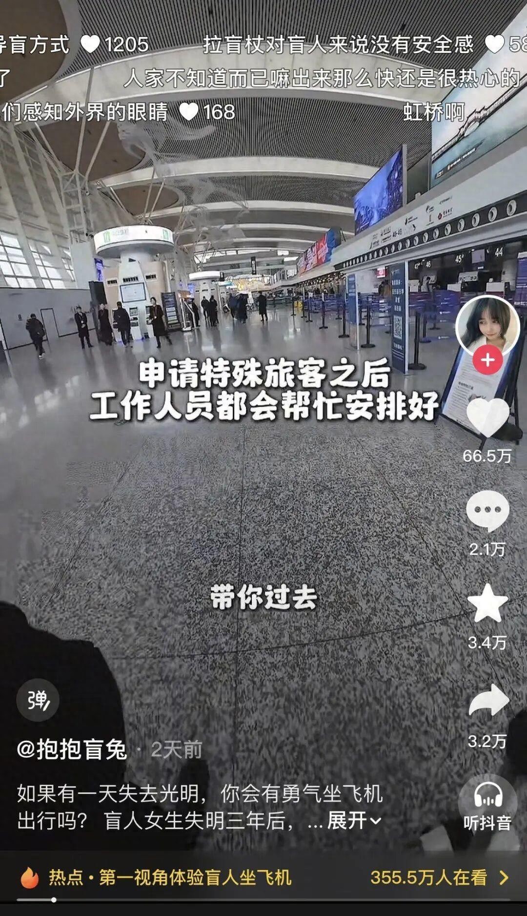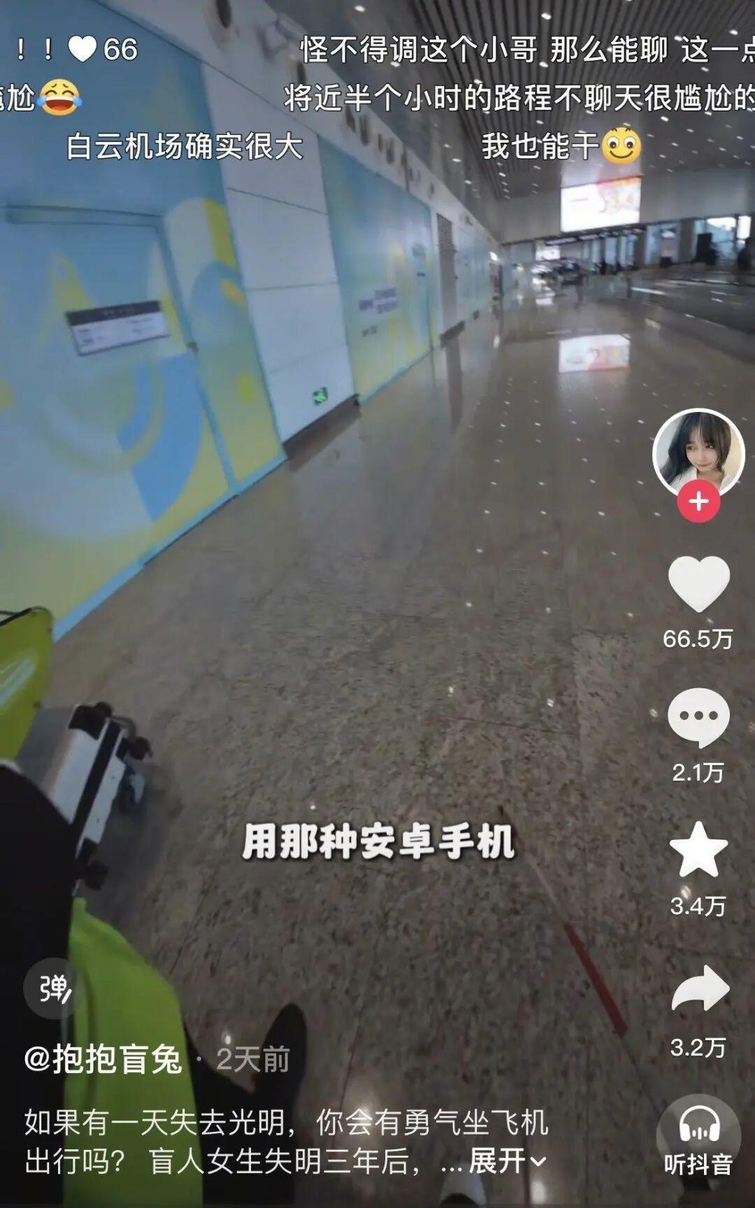 近日,视障博主“抱抱盲兔”发布了一段独自坐飞机的视频,以第一视角记录下了她从无锡飞往广州的乘机出行全过程,引发网友广泛关注。截至记者发稿,该视频在抖音平台已收获3400万浏览、超65万点赞。