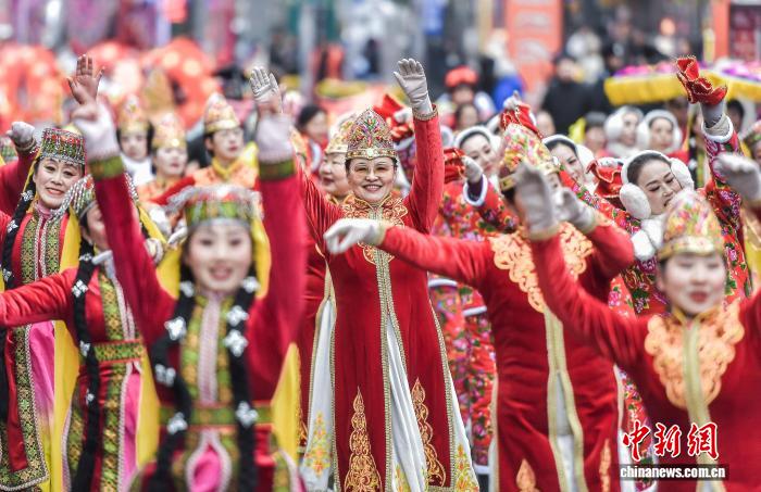 2月5日,新疆乌鲁木齐市闹市区西门老街锣鼓喧天,一场社火展演游街活动在此举行,吸引众多过往市民驻足观看。 中新社记者刘新摄