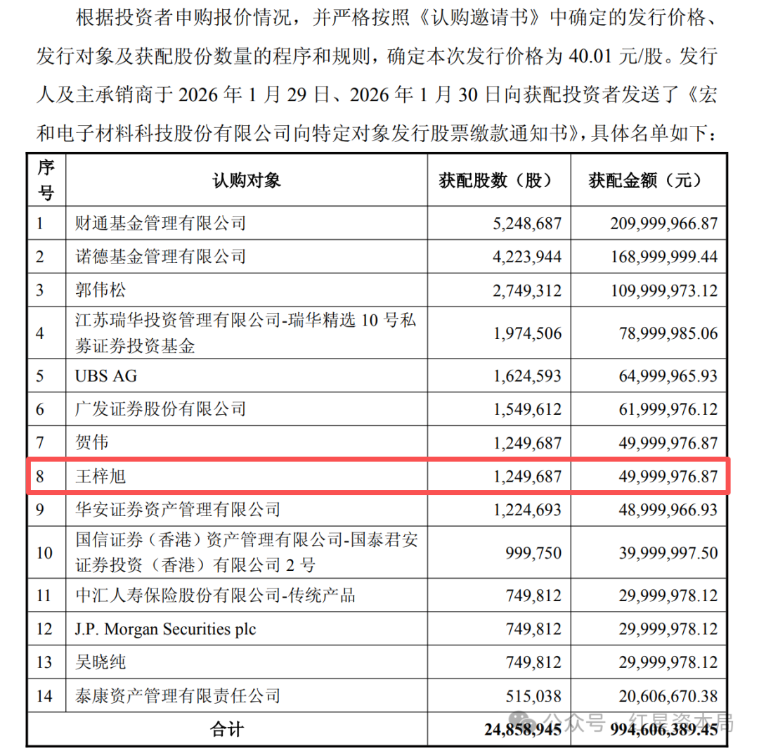 此次交易,王梓旭认购了宏和科技非公开发行的124.97万股股票,认购价格为40.01元/股,认购总价近5000万元。