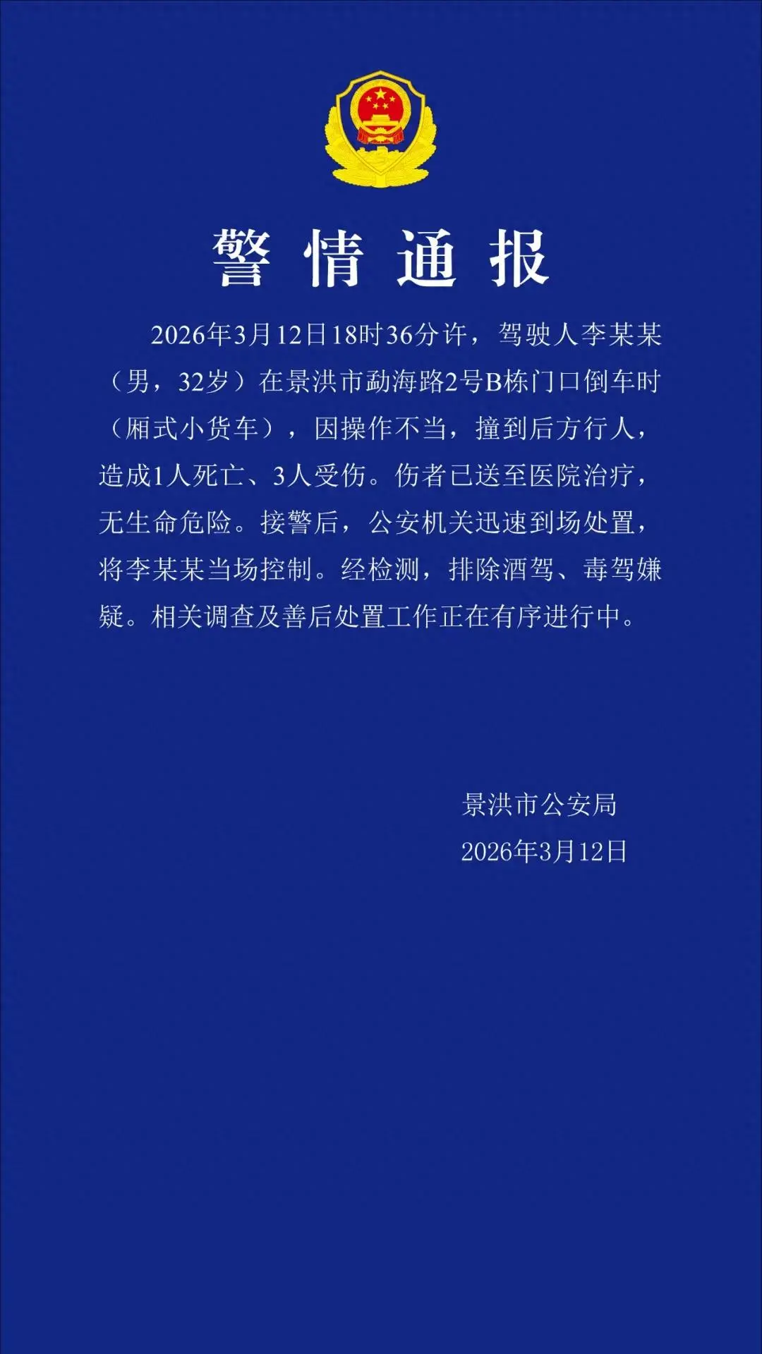 3月12日18时36分许,驾驶人李某某(男,32岁)在景洪市勐海路2号B栋门口倒车时(厢式小货车),因操作不当,撞到后方行人,造成1人死亡、3人受伤。伤者已送至医院治疗,无生命危险。接警后,公安机关迅速到场处置,将李某某当场控制。经检测,排除酒驾、毒驾嫌疑。相关调查及善后处置工作正在有序进行中。