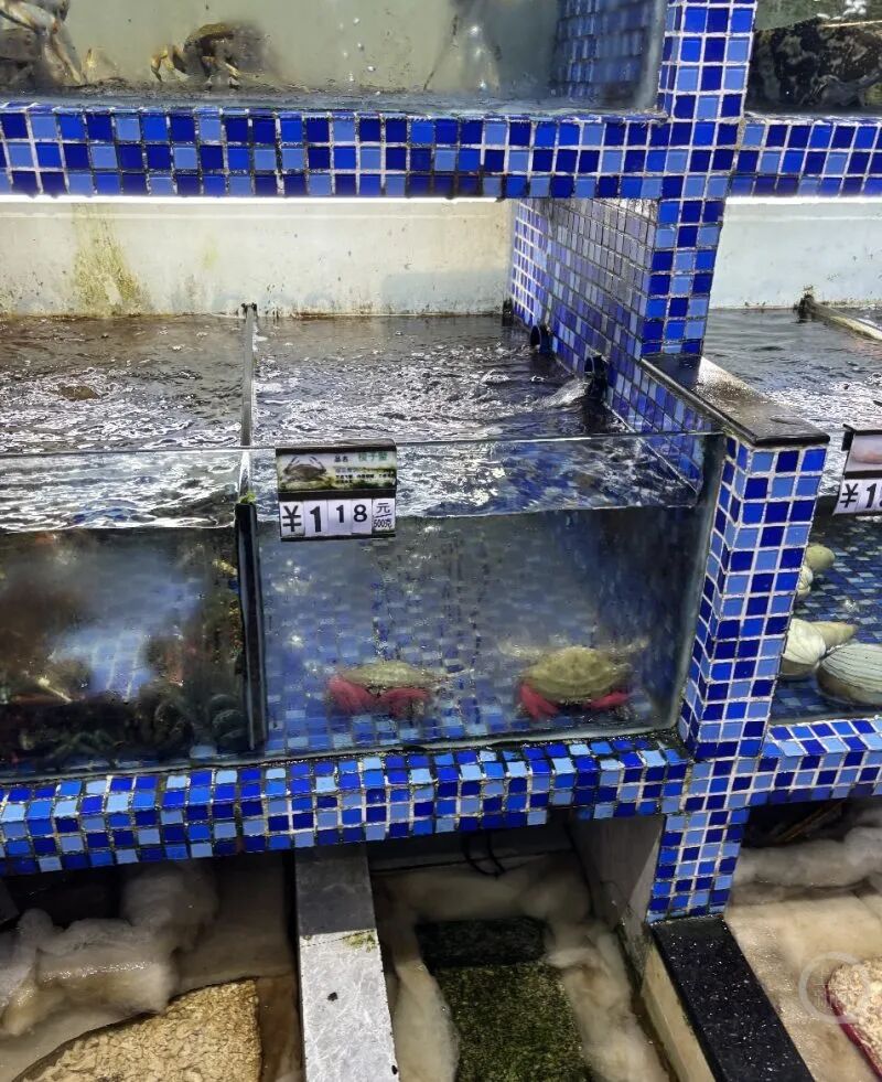 在一家海鲜经营户前,记者看到水箱中的梭子蟹均被粗大的泡沫状绑绳缠住蟹钳。水箱玻璃外侧的价格标签显示:梭子蟹118元/500克。