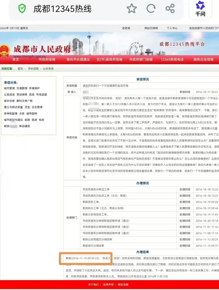 据成都市“市长信箱”显示的“办理结果”,辖区派出所犀浦派出所接警后,在小区周边进行了走访、勘察、调查,截至2016年11月15日,未发现可疑人员及车辆。这位居民称,至今仍没结果。