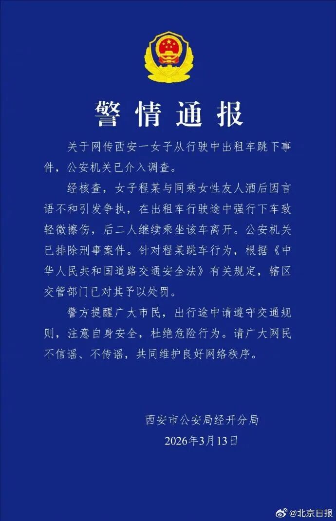 关于网传西安一女子从行驶中出租车跳下事件,公安机关已介入调查。经核查,女子程某与同乘女性友人酒后因言语不和引发争执,在出租车行驶途中强行下车致轻微擦伤,后二人继续乘坐该车离开。公安机关已排除刑事案件。针对程某跳车行为,根据《中华人民共和国道路交通安全法》有关规定,辖区交管部门已对其予以处罚。