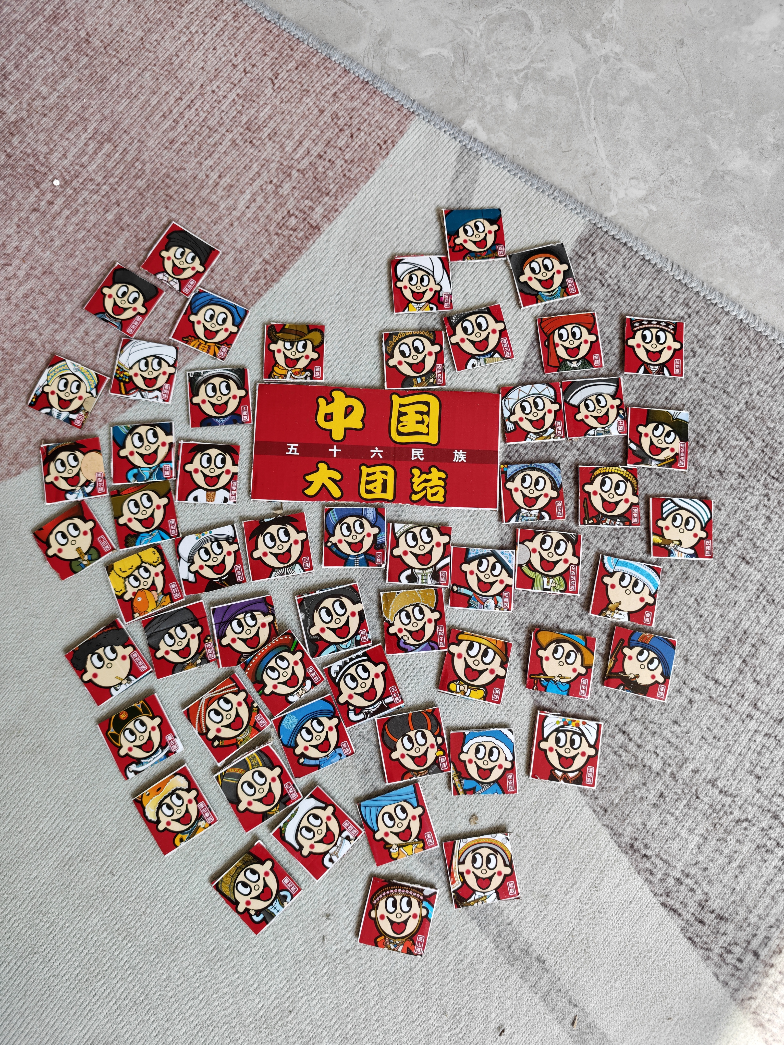 今年上二年级的史子妤做这本豆豆本的创意,源于家里的一次日常对话。当时她看到家里有个旺仔牛奶的纸箱,外包装上有56个民族装扮的“小旺仔”,就惊喜地问爸爸纸箱还有没有用。得知爸爸准备扔掉后,想到“一年级上册语文课的第一篇课文就是56个民族”,史子妤当即决定把箱子做成豆豆本。