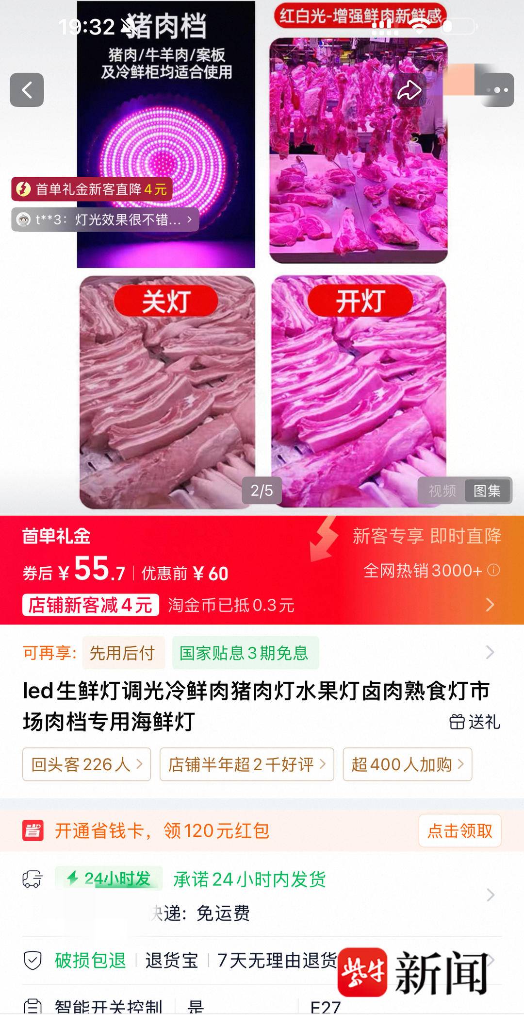 3月12日晚,扬子晚报/紫牛新闻记者在多家电商平台搜索“生鲜灯”“猪肉专用灯”等关键词,发现大量与市场外肉铺使用款式相似的灯具。部分商品详情页直接标注“新国标”“提鲜增红”“肉类专用灯”等宣传语,售价从几十元到两百元不等,部分店铺月销量可达数千件。
