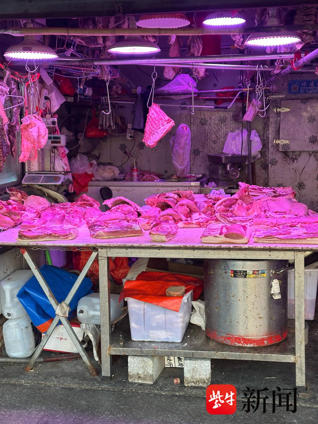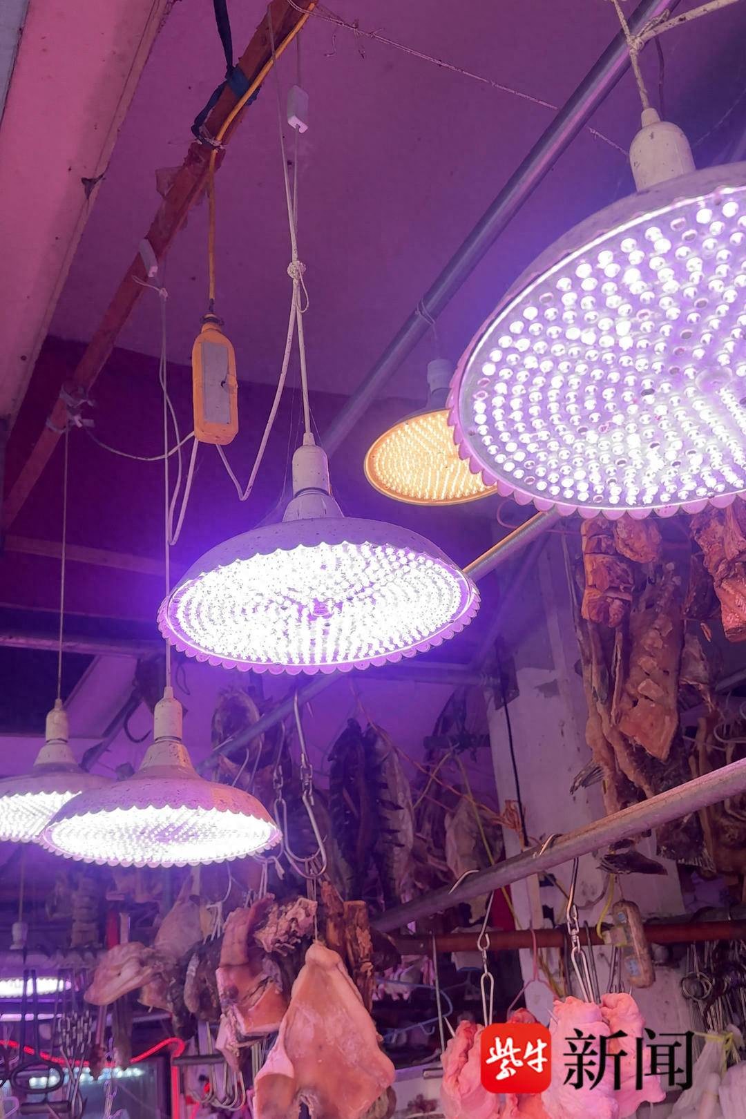 “那几家肉铺的灯照着,根本看不出肉的真实颜色!”近日,苏州市民李先生向扬子晚报反映,苏州市相城区黄埭镇农贸市场外部7家零售肉铺,疑似违规使用“生鲜灯”。这种灯光将肉品照得格外鲜亮,导致消费者难以分辨其真实新鲜度。