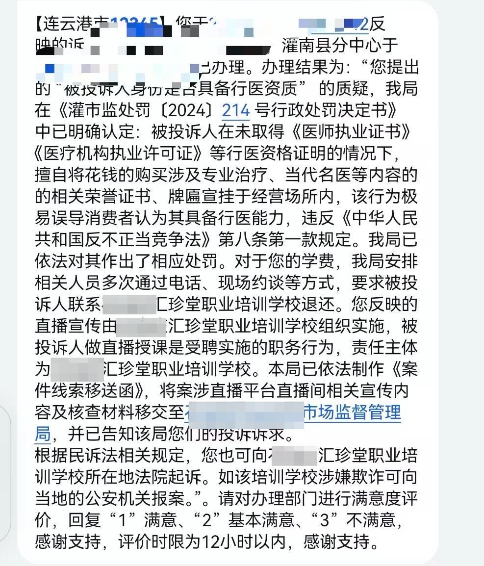 移交后地区的市监局曾有两次答复,一次回函称“灌南人喻某兵在灌南县某开设的直播间”不在辖区管辖。对于灌南县市场监督管理局让我局核实相关企业的情况,经我局核实,已经向灌南县市场监督管理局予以回复。另一次,其答复对于汇珍堂的虚假宣传投诉反映,称通过实地勘查,发现其未在注册地经营,后通过系统查询,该公司已于2024年11月4日注销。
