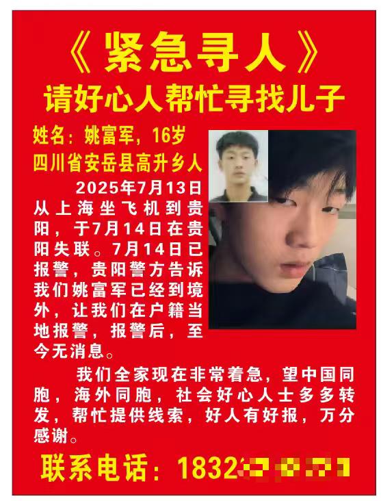 这位求助的妈妈是四川省安岳县的郑女士,她的二儿子姚富军今年16岁,2025年7月13日从上海坐飞机到贵阳,第二天失联。
