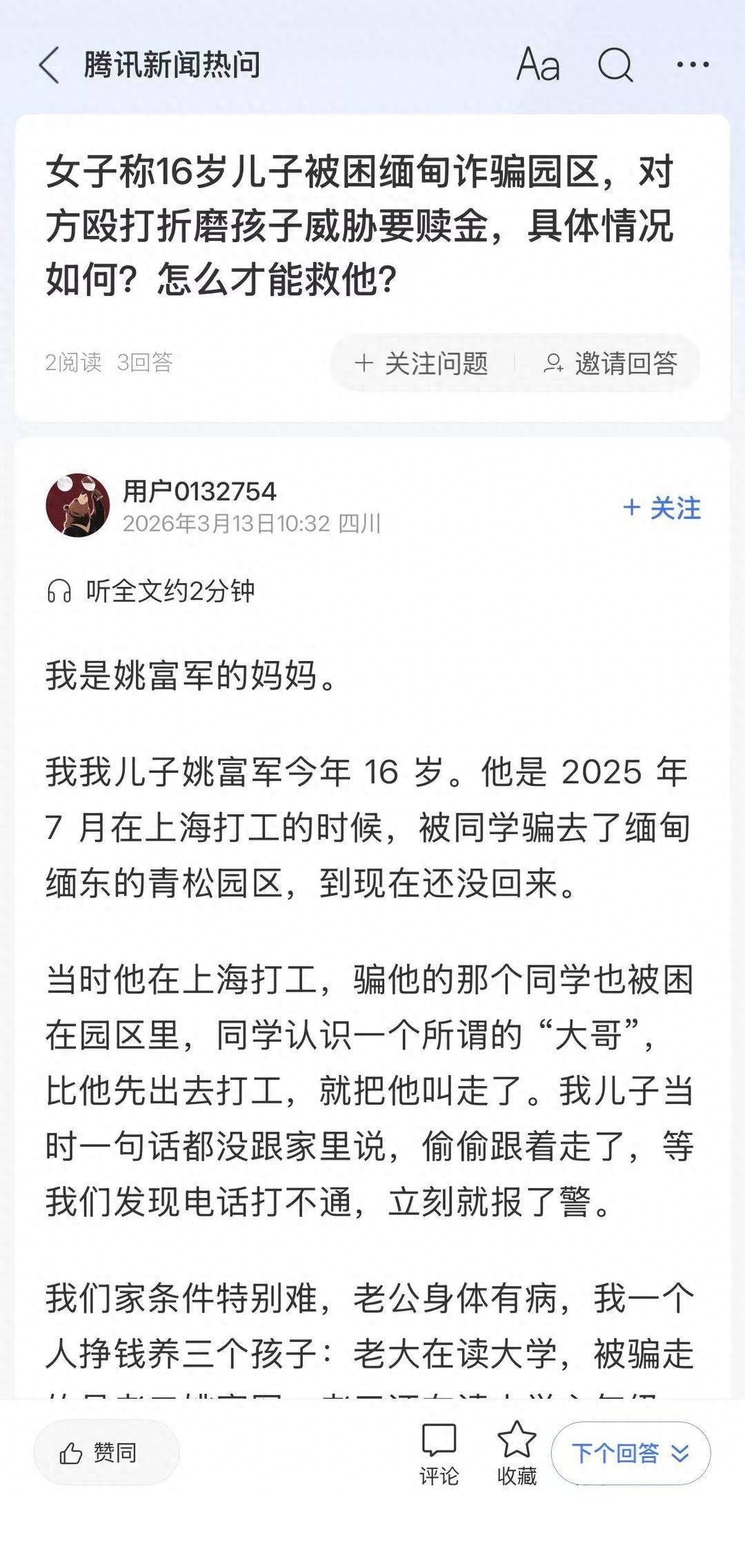 3月13日,一位四川妈妈腾讯热问求助,称其16岁的二儿子自去年7月被骗到缅甸电诈园区,多次挨打,园区还曾通过儿子的手机联系她,勒索高额赎金,威胁称如果不交钱,10年也不会放人。她说老公身体一直有病,家中全靠自己打工挣钱支撑,无力支付赎金,为孩子的安危日夜担心。
