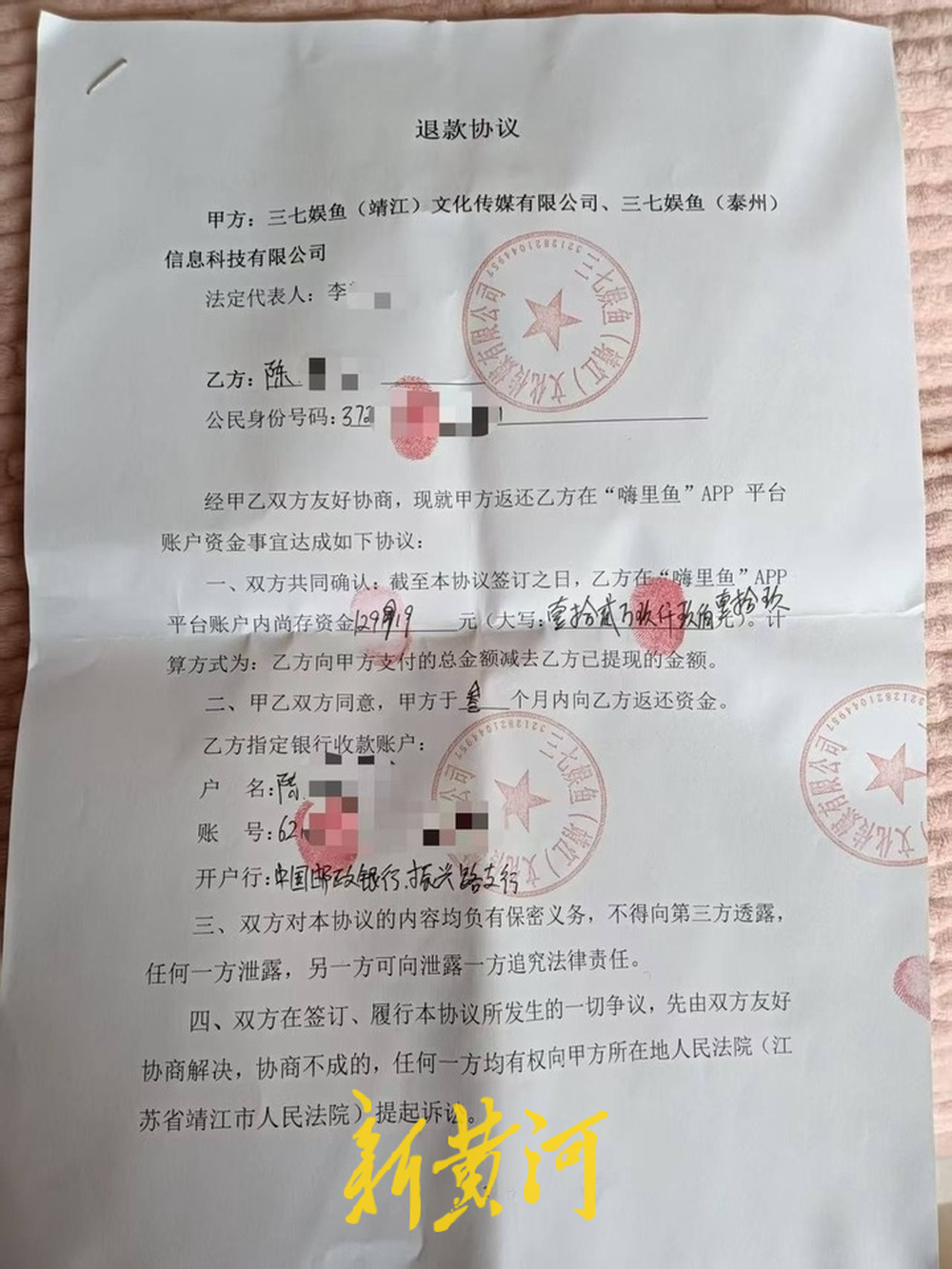 陈民签订短剧“认购协议”后,拿到了3期分红。但随后他得知,该公司涉嫌“集资”被监管。2025年12月29日,在相关部门监管下,三七娱鱼(靖江)文化传媒有限公司、三七娱鱼(泰州)信息科技有限公司与他签订退款协议,约定剩余本金129919元分三个月退还。然而,退款协议截止日期临近,陈民表示,除前3期分红被充当成本金退还外,他仅收到该公司7000元左右退款,剩余12万余元资金仍毫无着落。