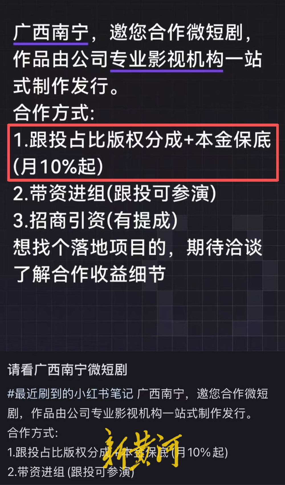 当记者追问投资回报周期时,对方回答含糊其辞,刻意营造“短期内高回报”的心理预期,声称签约后第二个月开始发放保底收益,剧集制作3个月后上线即可分红,还表示“爆款剧3个月就能回本”。
