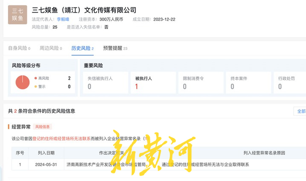 3月11日,记者拨打三七娱鱼(靖江)文化传媒有限公司登记电话,提示已为“空号”。据天眼查,三七娱鱼(靖江)文化传媒有限公司在2024年曾因登记住所或经营场所无法联系被济南高新技术产业开发区管委会市场监管局列入企业经营异常名录,后因违反《禁止传销条例》规定,在2025年10月27日被蒙阴县市场监督管理局罚款160万元,没收违法所得2490万余元。目前,该公司因涉及司法案件,被蒙阴县人民法院列为被执行人。