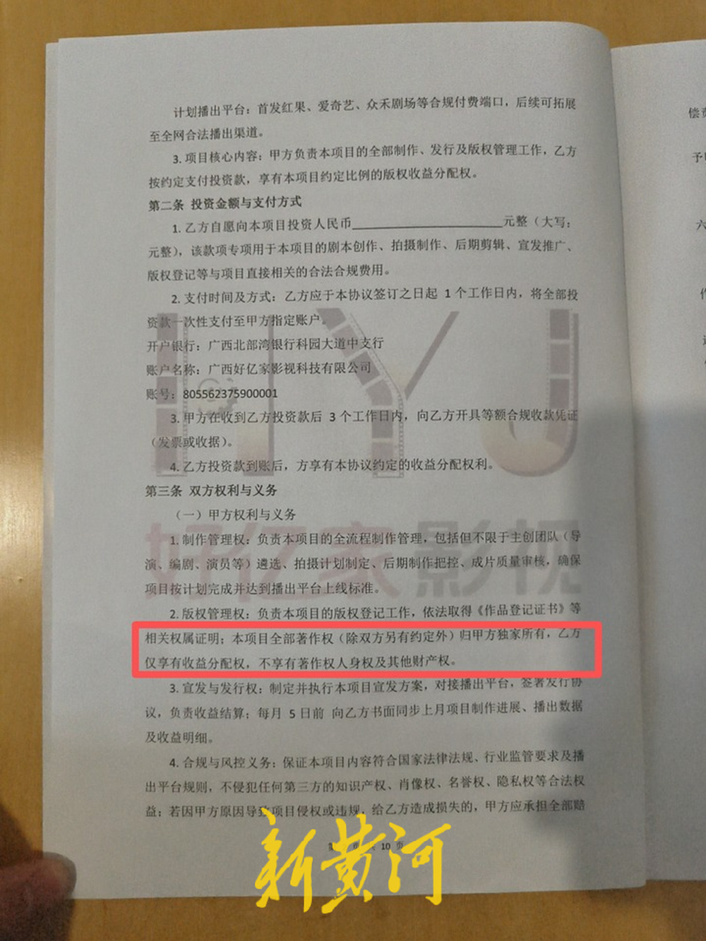 例如,协议中规定“赋予甲方全权负责制作、发行、版权管理,且乙方仅享有收益分配权,不享有著作权人及发行方利益”。金晓东介绍,这意味着乙方作为出资人,对本项目的核心决策(如预算执行、剧本定稿、主演选择、发行平台、发行价格等)没有任何话语权,双方权利与义务严重失衡。