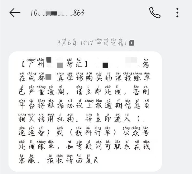 小李质疑对方属于霸王条款,但对方仅以“按合同约定办事”回应,还警告“不同意协商方案,后期将按合同条款执行”。3月6日,小李收到第三方公司的催收短信,称其课程账单已严重逾期,若不立即处理,将上报逾期信息至相关信用机构,这让尚未踏入社会的小李陷入巨大焦虑。