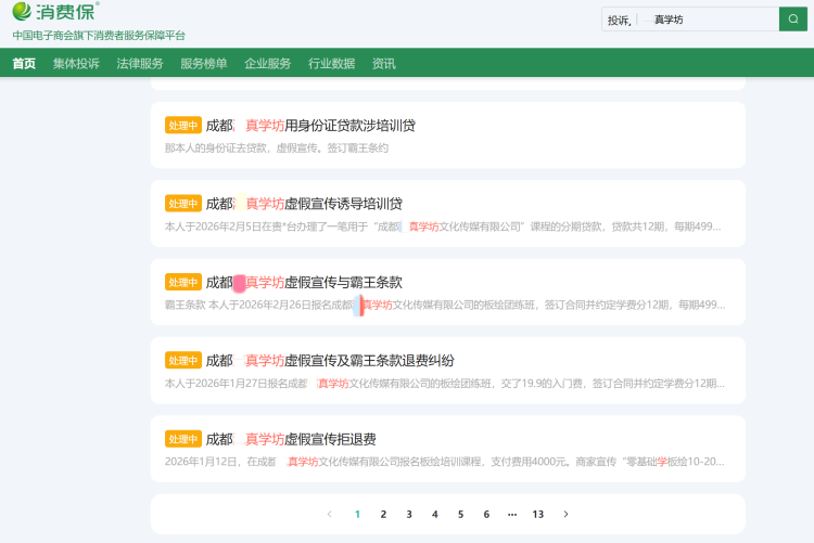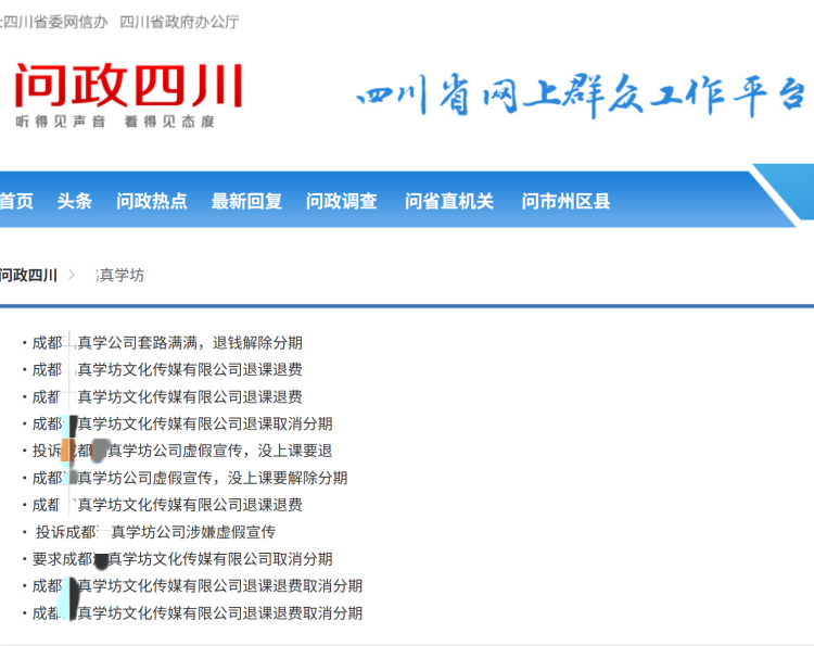 在问政四川和消费保平台上,有涉及成都某真学坊的大量投诉。图片来源:问政四川、消费保