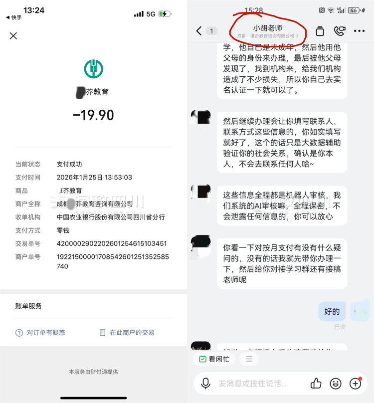 记者调查发现,小李的分期付费背后,同样涉及多家公司交叉运作。19.9元定金收款方为成都某芥教育公司,5988元课程费用由广州某运公司代收,催收短信则由另一家广州公司发送。在四川问政平台另一起相关投诉中,收定金的同样是成都某芥教育公司,咨询时工作人员却备注为成都某维合教育公司。