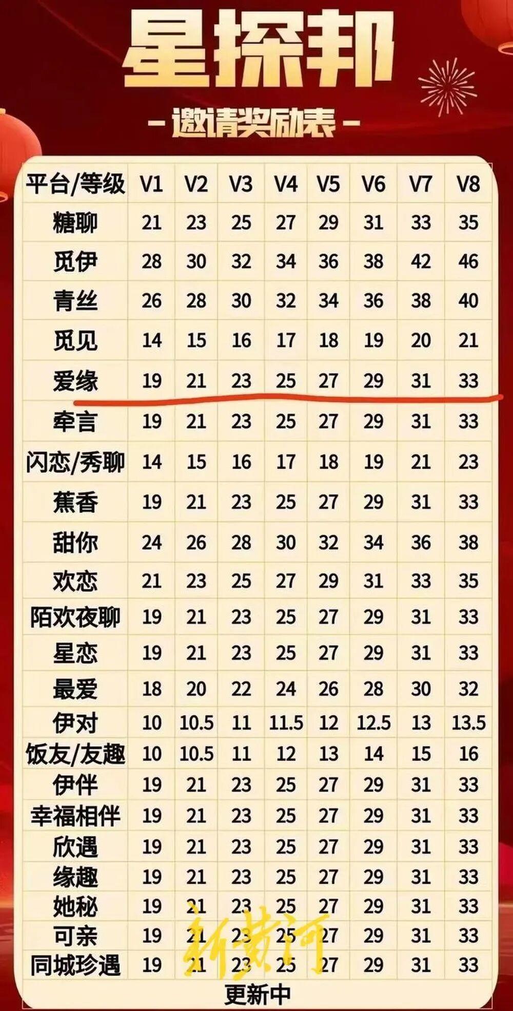 在一个名为“星探邦”平台的邀请奖励表中看到,其包含“伊对”“糖聊”“觅伊”等20余个App平台的奖励等级。“代理”共分为V1至V8八个级别,不同平台抽成比例各异。以“糖聊”为例,V1级别抽成21%,V8级别达35%;而在“觅伊”中,V1级别抽成28%,V8级别则高达46%。