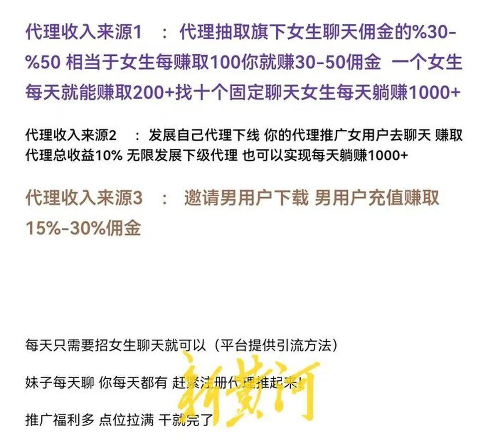 所谓“代理”,便是招聘聊天员的人员。有广告声称,在此过程中,“代理”的提成可达到15%~50%。只要拉的人数越多,聊天员的收益越多,“代理”的收入便可越多。