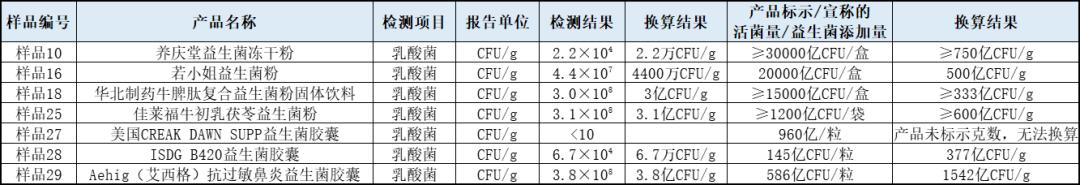 其中,样品10益生菌冻干粉的活菌量检测结果为2.2万CFU/g,对应的送检产品为养庆堂益生菌冻干粉(2024年10月23日生产),其包装标示的生产时活菌添加量≥30000亿CFU/盒,换算下来为≥750亿CFU/g。