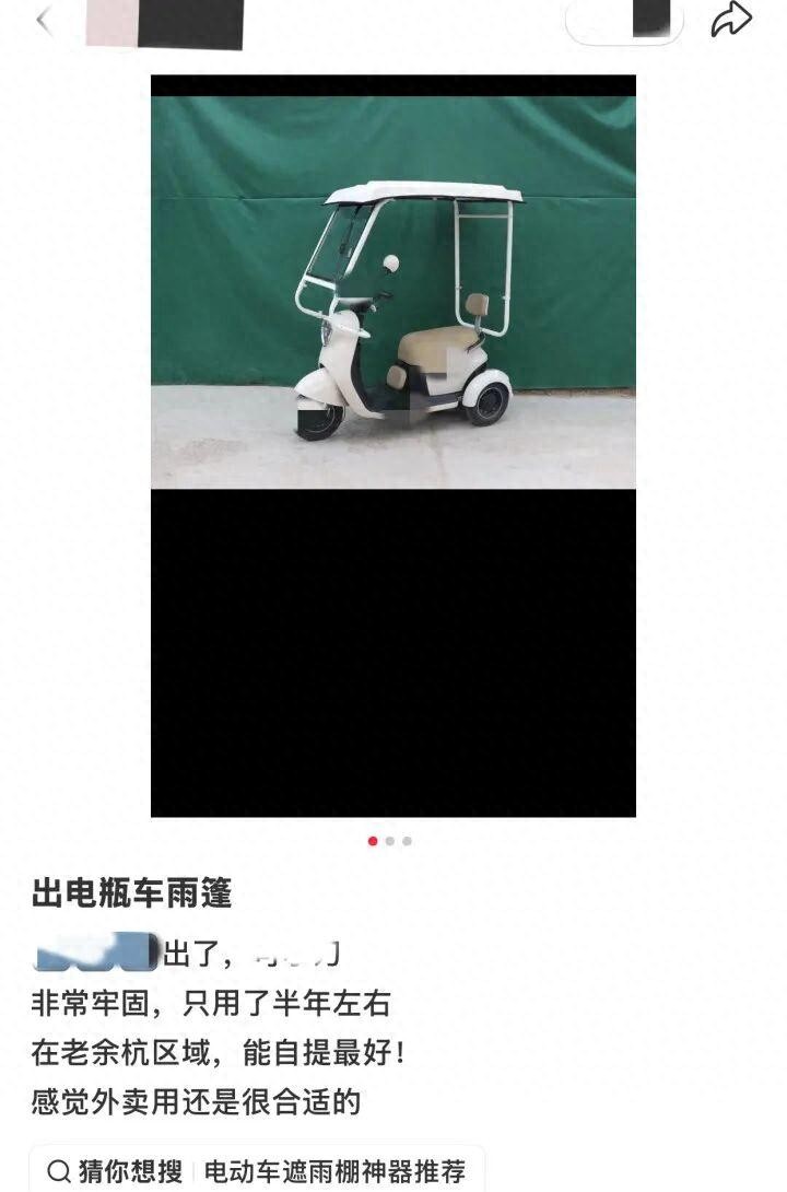 近日,杭州一位网友发帖说,非常牢固的电动车雨蓬,只用了半年,现在可以出售,最好能自提,感觉外卖用还是很合适。