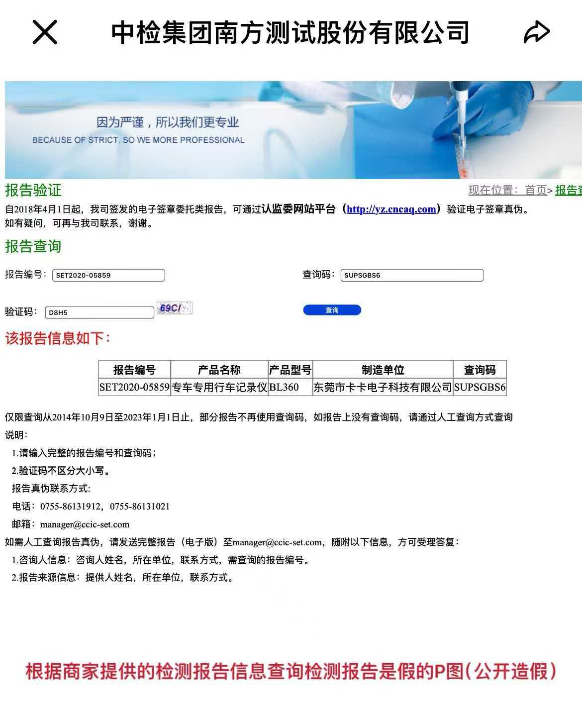 不久后,孙先生收到商家发来的检测报告,“只有首页,其他内容局部提供。”孙先生介绍,为了查证相关信息,他将商家提供的报告查询码在出具报告的中检集团南方测试股份有限公司官网进行查询,却惊讶地发现,查询结果与他购买的商品及型号竟毫不相干,查出来的产品系东莞一家电子科技公司生产的型号为BL360的行车记录仪。“不知道商家给我提供的检测报告是咋来的,很可能是P的图。”孙先生非常气愤,这商家不是明目张胆的造假么!