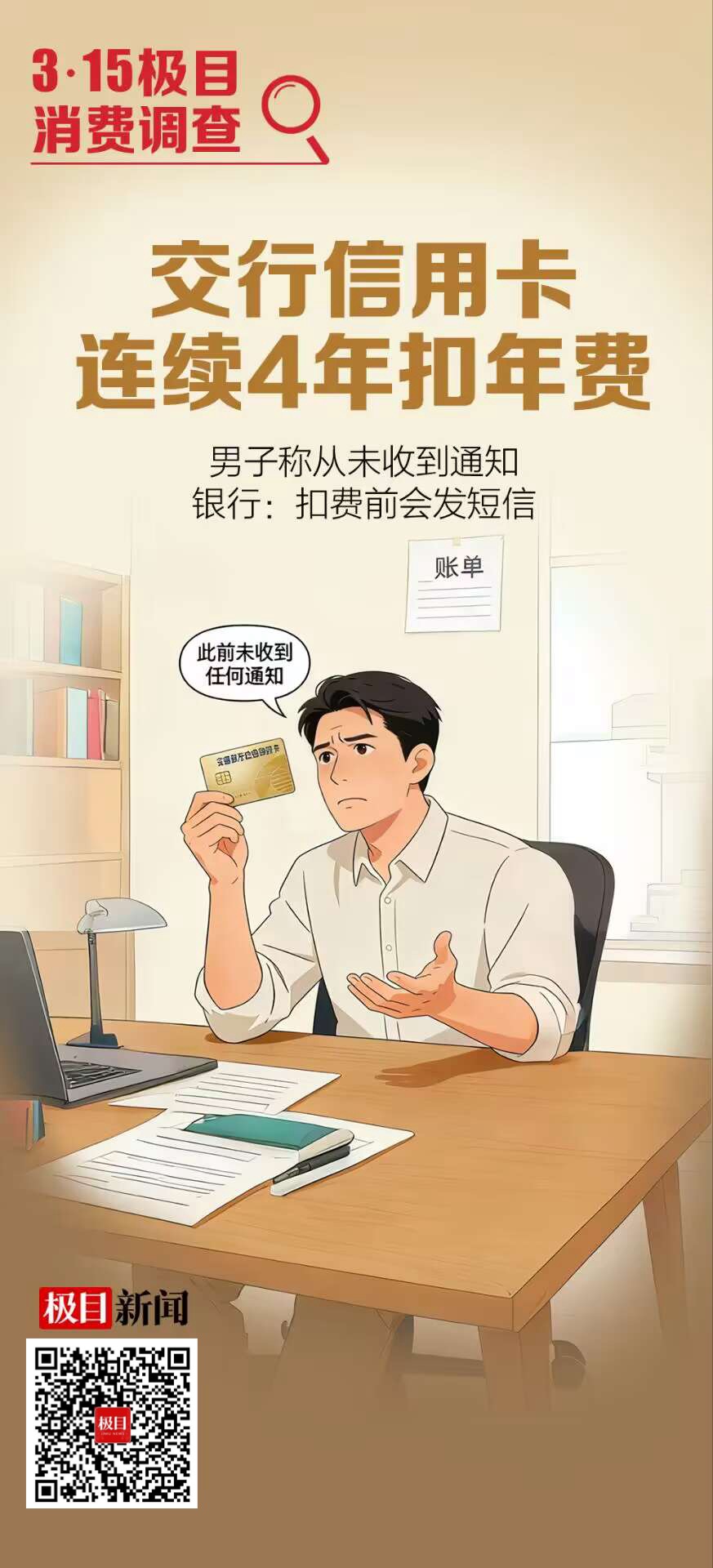 近日,来自吉林长春的李先生向极目新闻反映,2021年他办理了一张交通银行的信用卡,首年如业务员所说免除了1000元的年费,但从2022年开始至2025年,每年他在未收到短信、电话和邮件等任何形式通知的情况下被收取了4000元的年费,这让他感到难以理解。记者在投诉平台上搜索发现,有不少网友反映,自己曾遇到未收到银行信用卡年费通知而被扣费的情况。