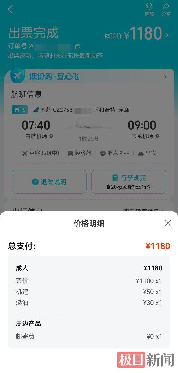 订单截图显示,刘女士购买的南方航空公司航班,价格明细中明确标注了票价为1100元,机建费50元,燃油费30元。另外还有一项为“周边产品邮寄费”,其标注价格为0元。整个订单总价为1180元。