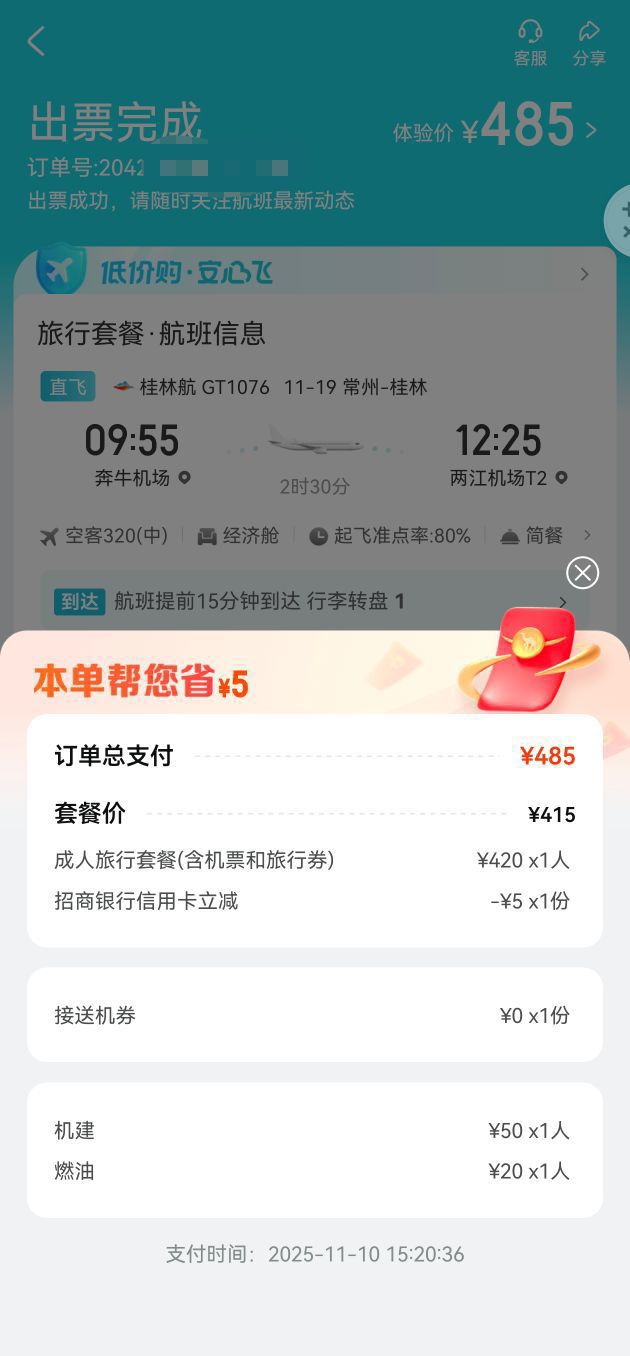 江苏常州的张女士(化姓)告诉极目新闻记者,2025年11月10日,她通过“去哪儿”购买了一张吉林航空公司从常州飞往桂林的机票,花费人民币485元。这趟航班的执飞时间是11月19日上午9时55分,当天她一大早就赶到了常州奔牛机场,在机场候机厅,她通过航旅纵横APP查询航班信息时,无意间发现,她购买的这趟航班在航旅纵横上的价格竟然只要270元。