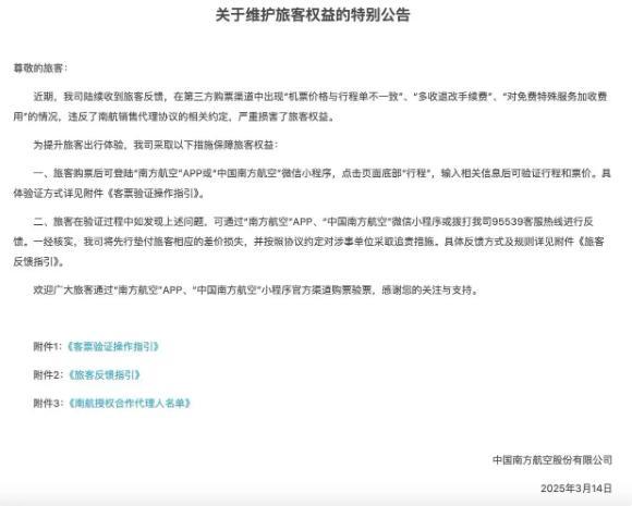 公开资料显示,中国南方航空股份有限公司曾在2025年3月发布《关于维护旅客权益的特别公告》,公告中指出,该公司陆续收到旅客反馈,在第三方购票渠道中出现“机票价格与行程单不一致”“多收退改手续费”“对免费特殊服务加收费用”的情况,违反了南航销售代理协议的相关约定。旅客如发现上述问题,可通过“南方航空”APP、“中国南方航空”微信小程序或拨打该司95539客服热线进行反馈。一经核实,该司将先行垫付旅客相应的差价损失,并按照协议约定对涉事单位追责。