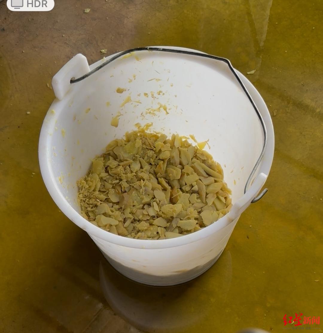 红星新闻记者在现场看到,厂区外的空地上晾晒着许多已制好的假天麻切片;而在厂房内部,数个白色大桶中装着泛黄的液体,成吨的芭蕉芋果浸泡其中,发出刺鼻气味。蒸煮芭蕉芋果的机器不断沸腾,工人刚捞出煮好的果子,又迅速将另一桶泡好的鲜果倒入。厂房的墙角下,还存放着尚未用完的色素粉末和亚硫酸钠添加剂。