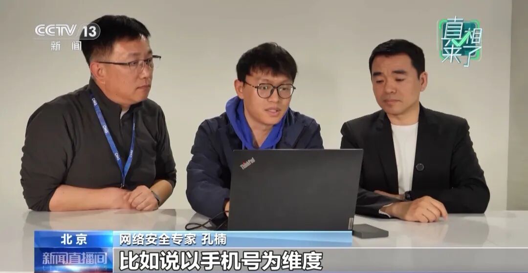 网络安全专家 孔楠:比如说以手机号为维度,然后我们可以进行搜索,当敲入你的手机号之后,然后它会把跟你手机号有关联的所有数据全部展示出来。
