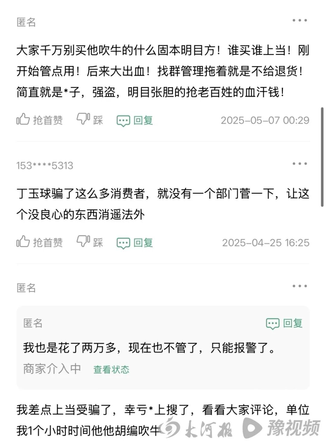 记者注意到,在这些信息下方,部分网友称他们常看丁玉球的直播,这些直播通常以“养生健康课”为名。有网友因其直播课而十分“信任”丁玉球: “大家爱听,(直播间)没封是不是说明药有点用?”截至目前,记者在常用的社交媒体平台上已搜索不到丁玉球的相关账号。