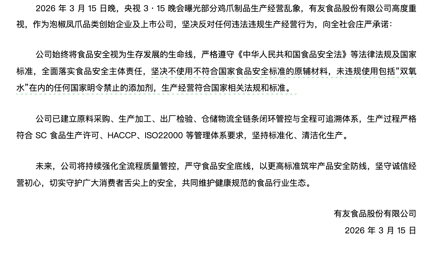 有友食品股份有限公司3月15日发布声明:央视3・15晚会曝光部分鸡爪制品生产经营乱象,有友食品股份有限公司高度重视,作为泡椒凤爪品类创始企业及上市公司,坚决反对任何违法违规生产经营行为。公司坚决不使用不符合国家食品安全标准的原辅材料,未违规使用包括“双氧水”在内的任何国家明令禁止的添加剂,生产经营符合国家相关法规和标准。