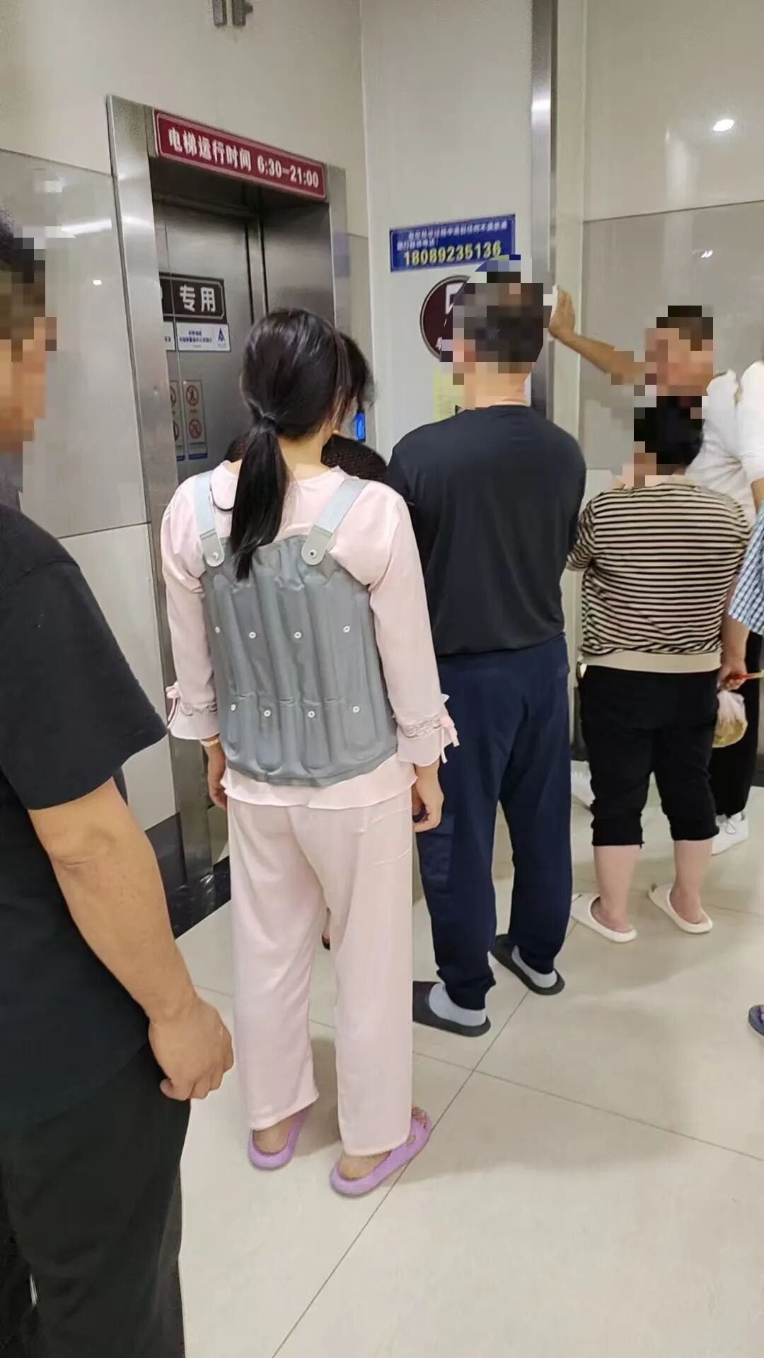 小苏还发来多位身穿支具的患者在医院病房、走廊、电梯前等场景中拍摄的照片。大家穿的支具与薛先生母亲所穿的那款款式并无差异。其中一张照片里,一位患者正站在医院电梯前排队,电梯旁的墙面上清晰可见一个电话号码。而该电话就是凤城医院的电话。