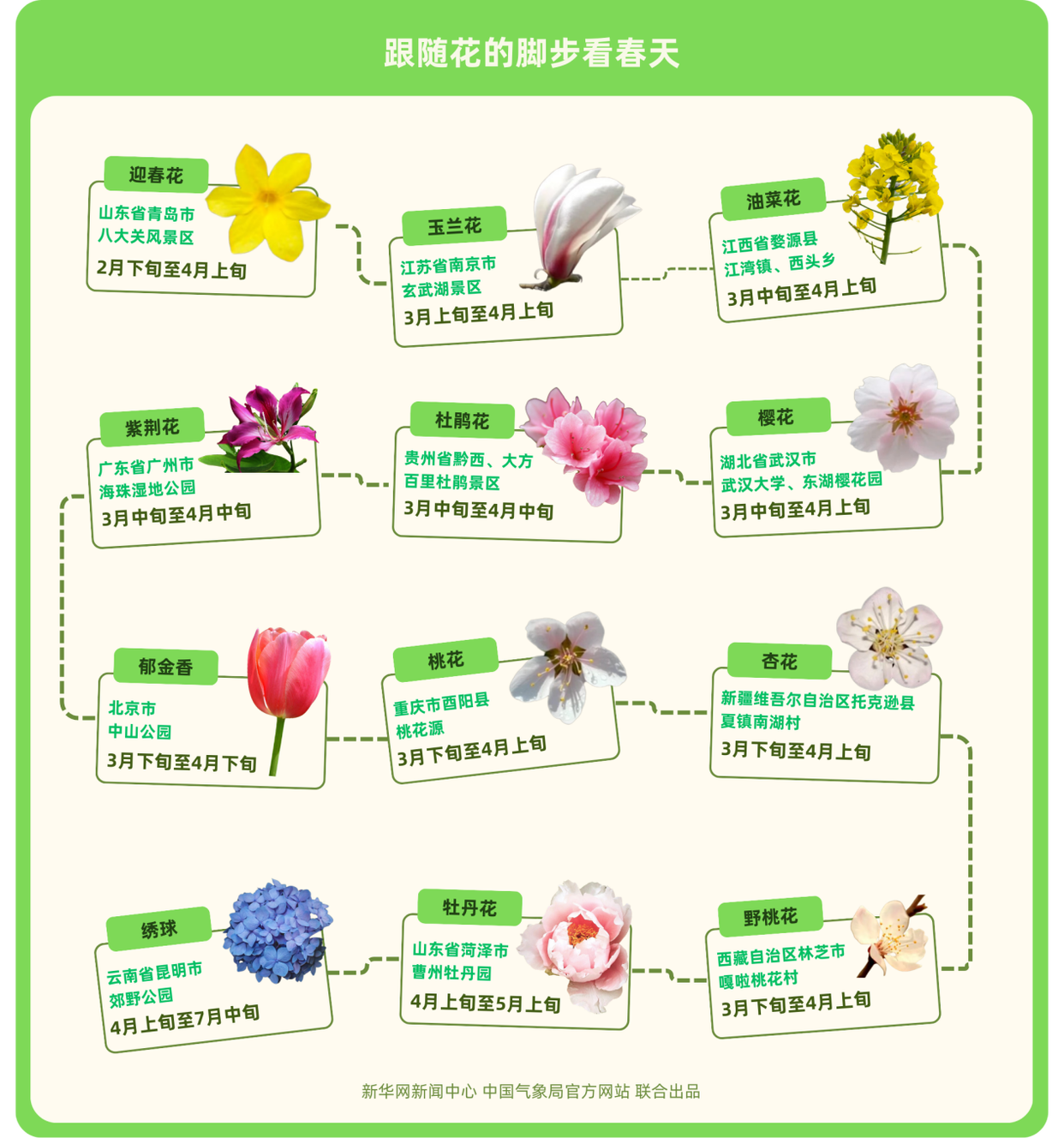 春风拂面,暖意渐浓。3月以来,我国大部气温明显回升,从南至北,各色花卉次第绽放,迎来赏花踏青的最佳时节。如何在短暂的春日里邂逅最绚烂的花景?花朵绽放与哪些气象因素息息相关?花期是否真的在悄然提前?快跟随这份春日赏花地图,一起踏上寻芳之旅吧!
