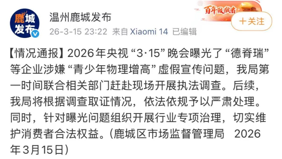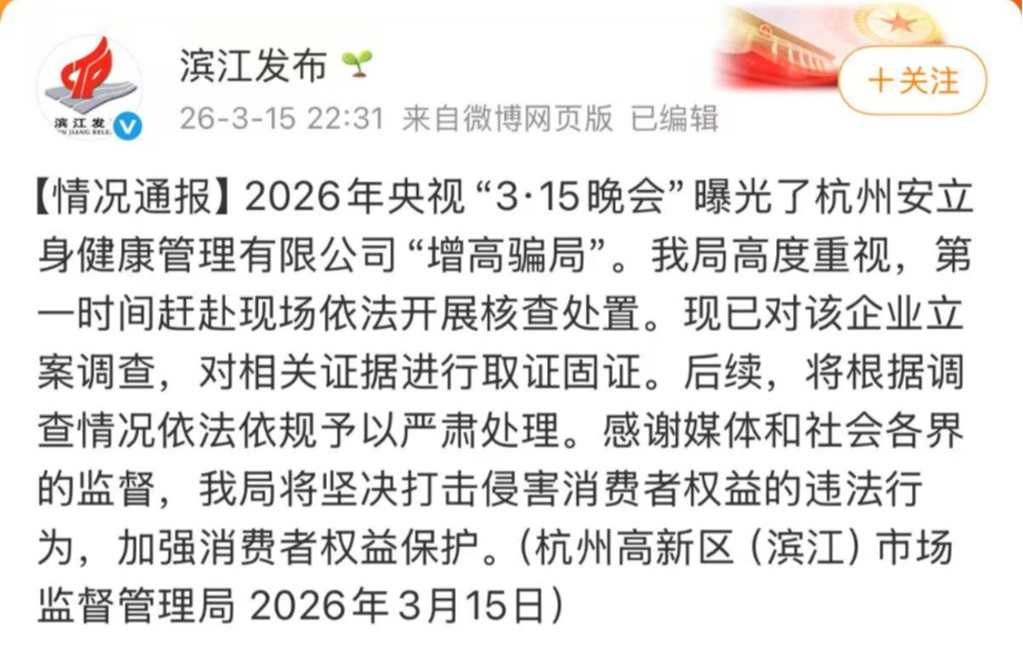 与此同时,杭州高新区(滨江)市场监督管理局也于3月15日晚第一时间赶赴现场依法开展核查处置,并于当晚22时31分发布情况通报称,杭州安立身健康管理有限公司涉嫌“增高骗局”。该局将坚决打击侵害消费者权益的违法行为,加强消费者权益保护。