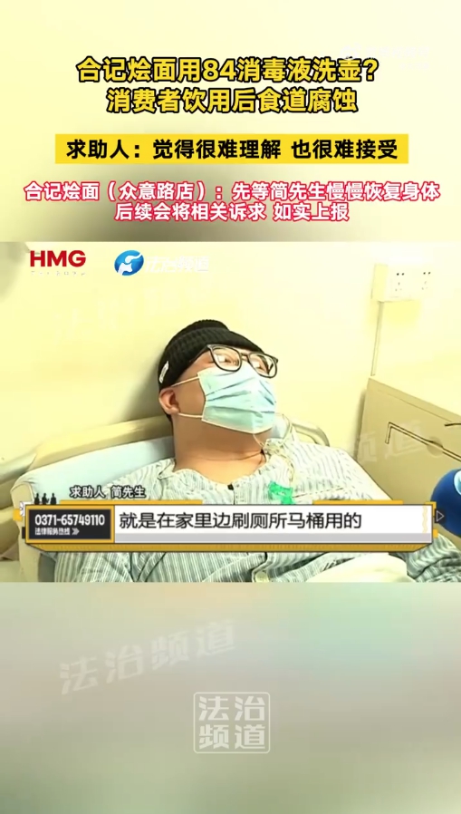 彼时,郑州合记烩面众意路店负责人接受媒体采访时表示,店里平时不允许这样做,服务员为了图省事,私自将原本用作打扫卫生的84消毒液,滴了一滴清洗水壶,另一名服务员在不知情的情况下拎上了餐桌。