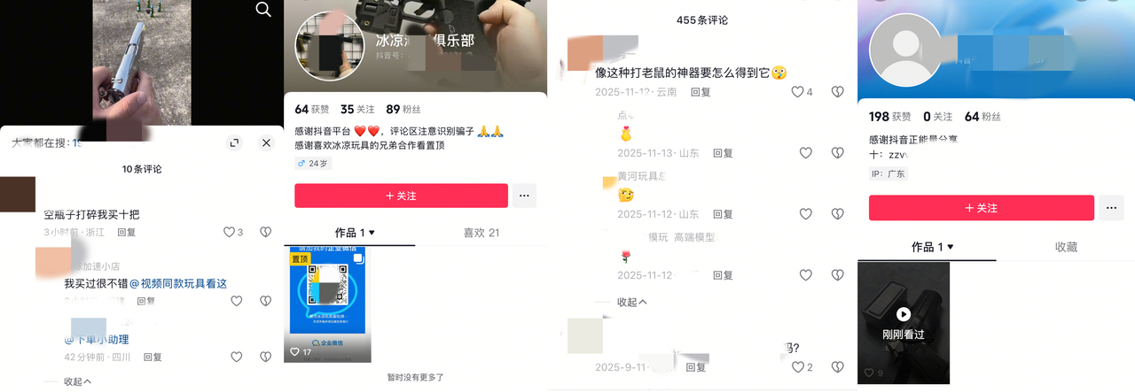 一位行业知情人士透露,由于销售端与生产端高度分离,溯源难度较大。“很多卖家对玩具枪的具体参数一无所知,只是负责销售。一旦发生伤人事件,追责将非常困难。”该人士表示,目前短视频平台和主流电商平台已开始对相关销售行为进行封禁,但部分圈内卖家与买家转而使用暗语、黑话等方式交流,不断规避平台违禁词审核,使得监管面临持续挑战。