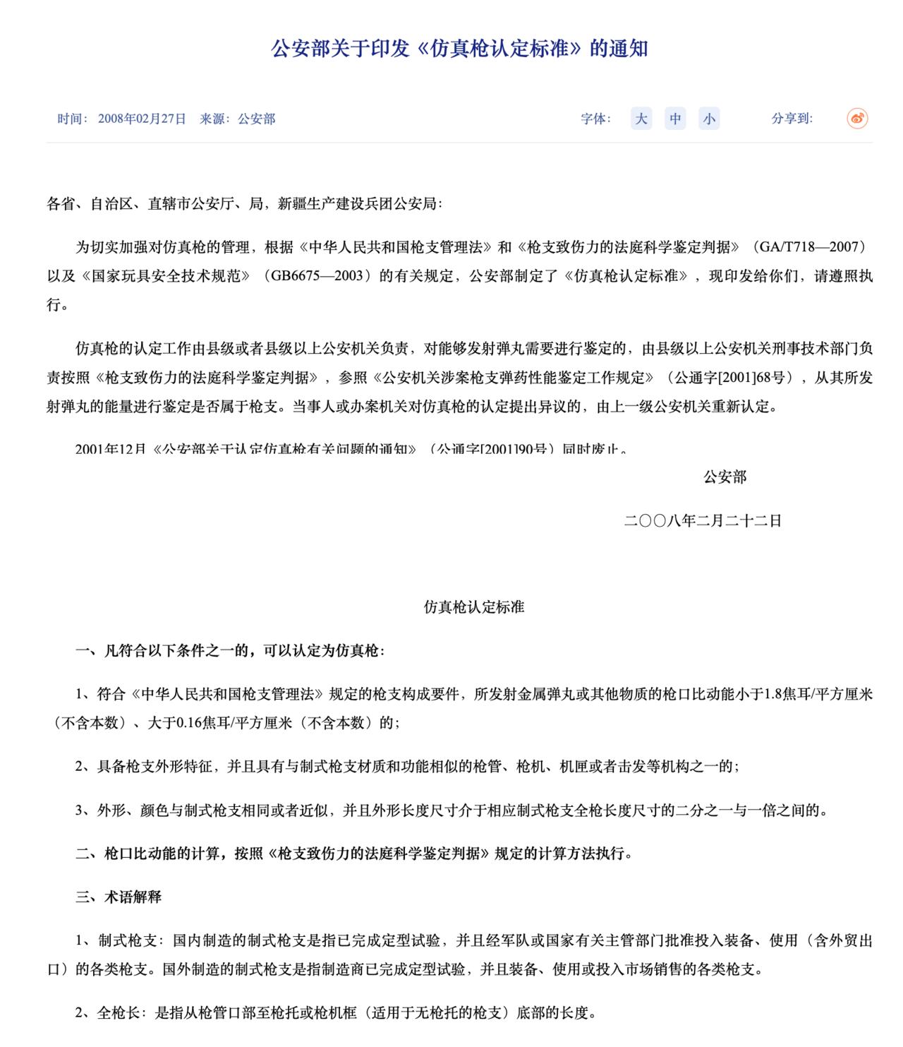 潮新闻记者查阅公安部官方网站信息发现,根据2008年发布的《公安部关于印发〈仿真枪认定标准〉的通知》,凡符合下列条件之一的,可以认定为仿真枪:1、符合《中华人民共和国枪支管理法》规定的枪支构成要件,所发射金属弹丸或其他物质的枪口比动能小于1.8焦耳/平方厘米(不含本数)、大于0.16焦耳/平方厘米(不含本数)的;2、具备枪支外形特征,并且具有与制式枪支材质和功能相似的枪管、枪机、机匣或者击发等机构之一的;3、外形、颜色与制式枪支相同或者近似,并且外形长度尺寸介于相应制式枪支全枪长度尺寸的二分之一与一倍之间的。
