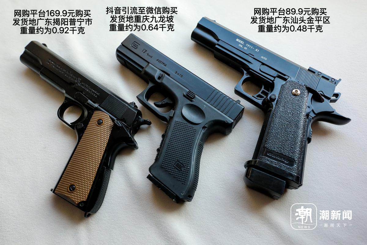 根据家长反映的线索,潮新闻记者分别在某网购平台及短视频社交平台搜索“手拉玩具枪”的销售信息,并顺利网购到三把相关产品。