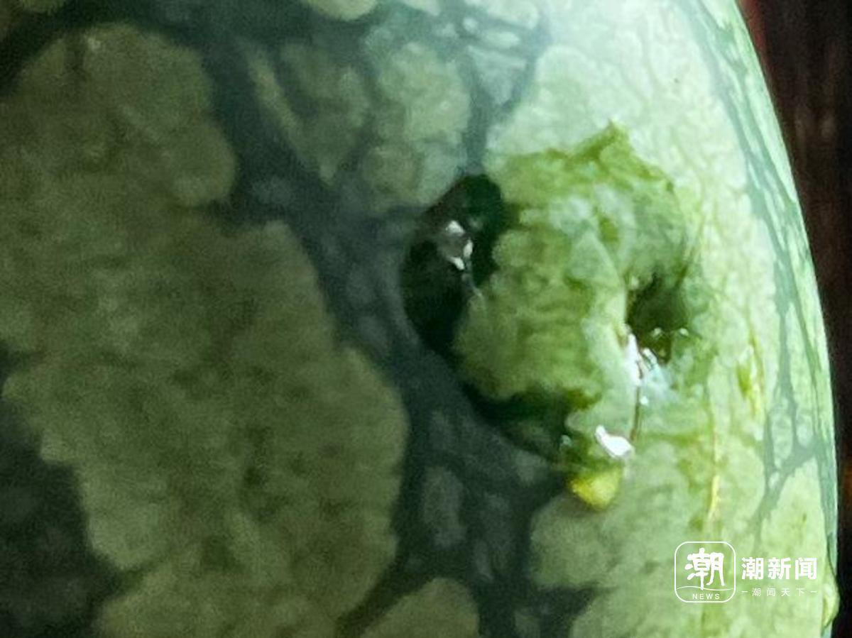 手拉玩具枪的弹丸射入西瓜瞬间。谢春晖/摄
