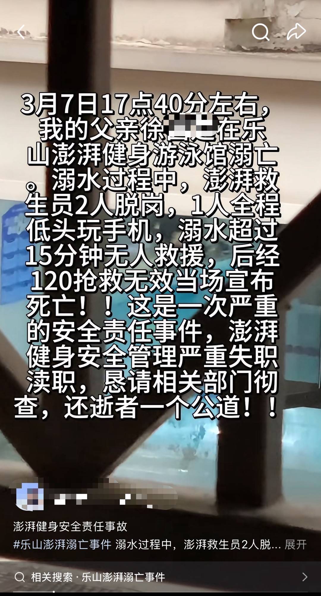 3月15日晚,四川乐山徐女士发帖称,其父亲徐强(化名)此前在当地一游泳馆锻炼时,不幸溺水身亡。