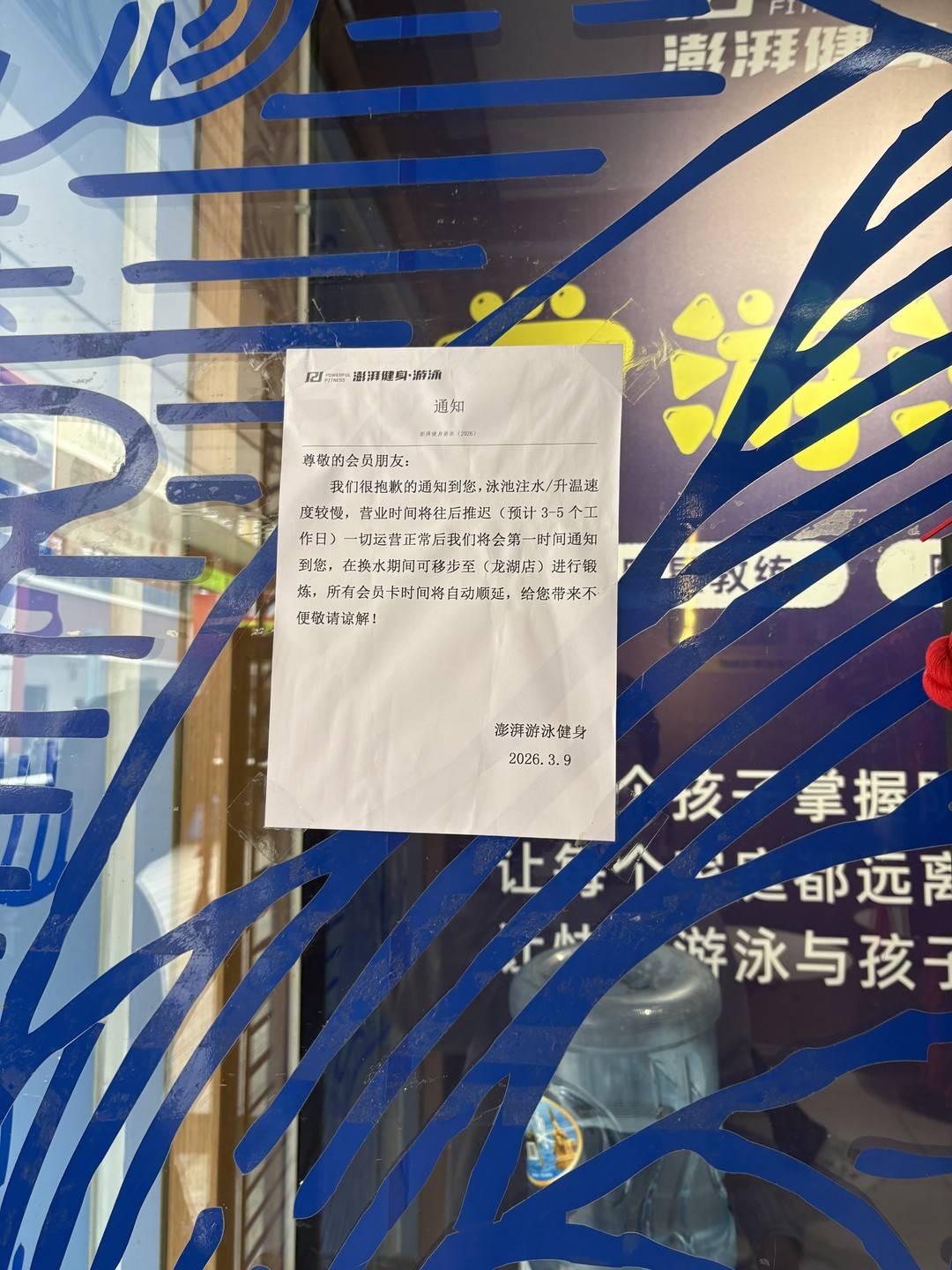 游泳馆玻璃门上有一张“通知”,上面写着:泳池注水/升温速度较慢,营业时间将往后推迟,在换水期间,会员可移步至别的分店进行锻炼。落款时间为3月9日。