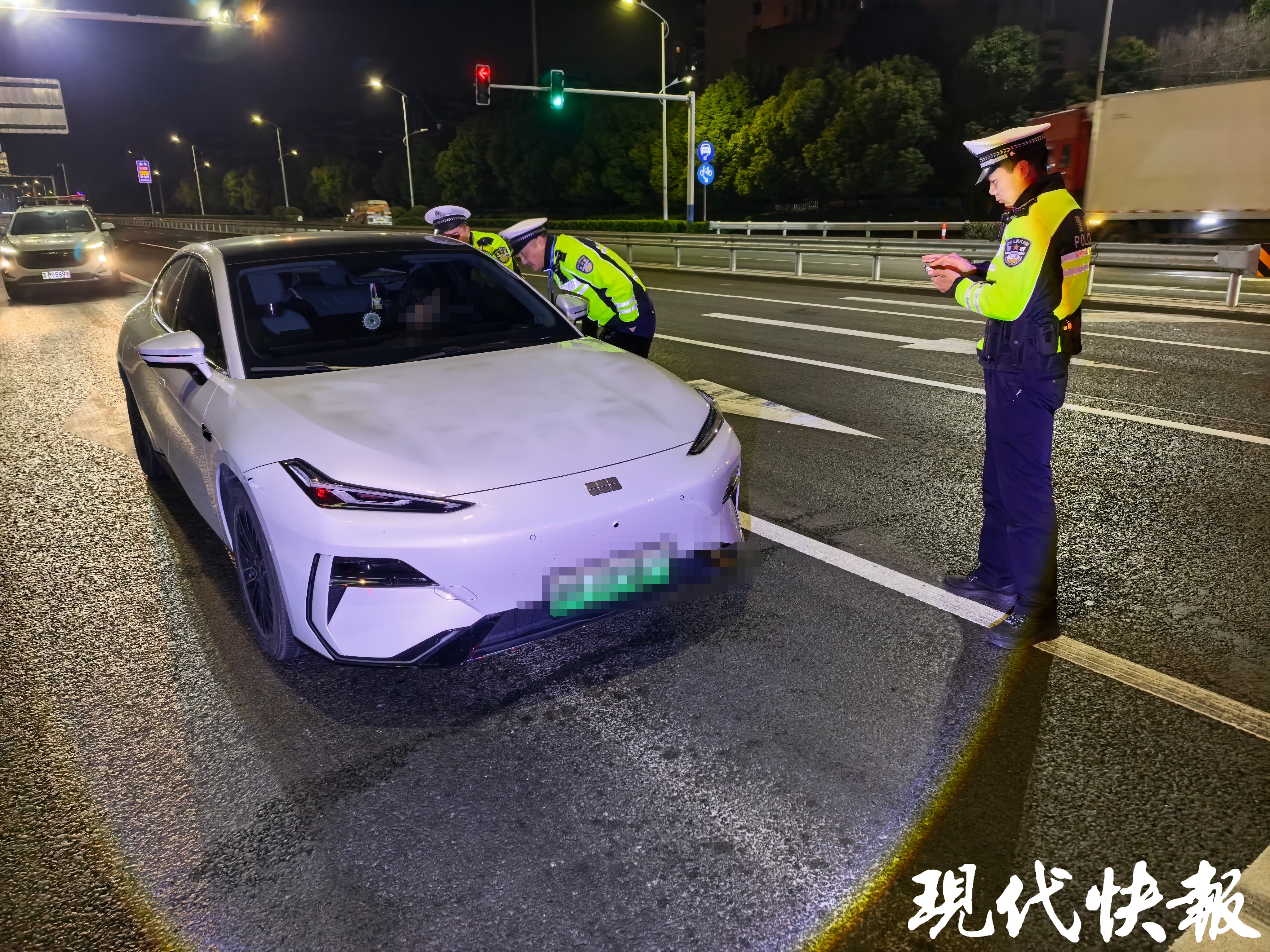 3月10日23时许,泰州市交管支队姜堰大队顾高中队民警张智、陈鑫鹏与值班辅警在国省道开展夜间巡查时,发现一辆白色新能源轿车停在红绿灯路口,车内有人急切地挥手呼救。